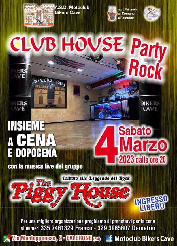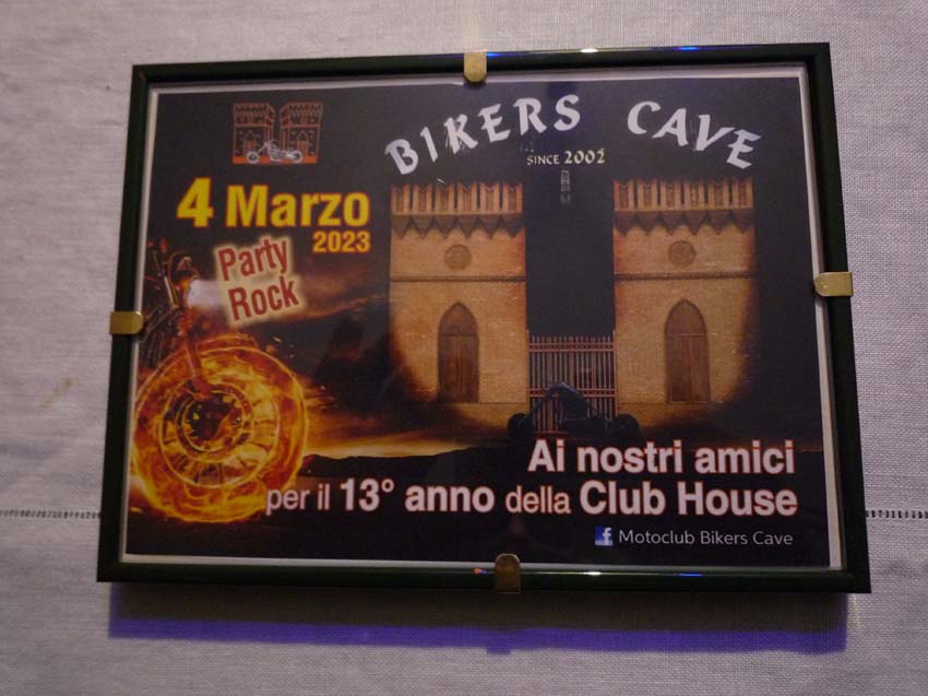 …lo staff dell’ASD – M.C. Bikers Cave (FMI) di Falerone (FM), ha organizzato per Sabato 04 Marzo 2023, insieme a cena & dopocena, il “13°Club House – Party Rock”… rustico Food & Birra, tributo di musica dal vivo, ecc… nella serata consegna “Targa Ricordo Evento”, per i Groups intervenuti, Reportage condiviso… speciale saluto al Pres.Franco & Staff tutto… tutt’ok!!!… di Angel.