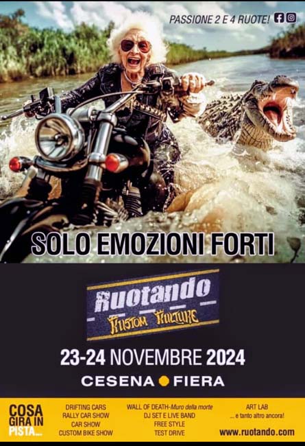 …la sinergia di diversi Attori, ha organizzato il “16°Kustom Kultute & Ruotando”, dal 23 al 24 Novembre 2024, presso la CesenaFiera (FC)… vasto il Programma offerto ai Bikers & Appassionati, spiccano CarShow, CustomBike Show, Dj Set & Live Band, Food & Beer, Bikers Shop… nell’Evento, noi Rappresentanza F.G.RiBej, scatti ricordo all’Ingresso… a seguire, al loro Stand doniamo il nostro Emblema (DAT4120), agli ideatori ed organizzatori di tutte le Edizioni, i Black Devils BD24 – Coast Crew – Chapter Italy… non che’ altri Scatti ricordo con il Biker Roby (Tasso) & Chapters M.C.GhostFire (FMI)… come ormai da Tradizione, lauto Pranzo presso noto Risto tipico romagnolo… nel rientro, sosta a casa del Biker Vito, da sempre nostro Supporter (DAT4120), per consegna nostro Emblema… Reportage condiviso in DUE parti, tutt’ok!!!… by Angel.