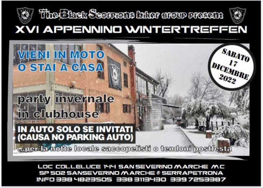 …lo Staff dei B.G.Black Scorpions, ha organizzato per Sabato 17 Dicembre 2022, presso la nuova ClubHouse in Localita’ Colleluce – San Severino Marche (MC), il “17°Appennino Wintertreffen”…Party invernale con Food & Beer nonche’ LiveMusic… con Locale saccopelisti per la Notte & Tendoni postfesta… occasione per consegnare al Presidente Luciano & Staff, una nostra TargaFriend augurale, per la nuova grande ClubHouse… Raportage condiviso, tutt’ok!!!… by Angel.