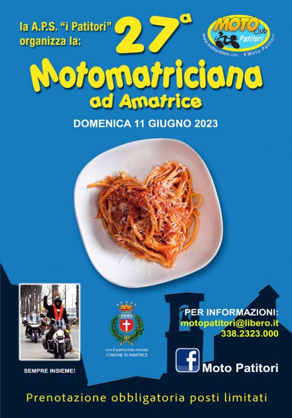 …lo Staff A.P.S. – MotoClub “I Patitori” di Latina (LT), hanno organizzo per Domenica 11 Giugno 2023, la “27°Motomatriciana”, ad Amatrice (RI)… (Evento solo su Prenotazione, di Promozione & Beneficenza, con Raccolta fondi), questa Edizione in “old out”, oltre il Sabato prima, Ritrovo presso il Piazzale del noto Risto, per la preventiva Premiazione Groups & Donatori, in sinergia il neo BikersGroup RI-BEJ (i Ribelli) & il B.C.DAT4120 all’Evento con Targhe & Gagliardetti… partenza Tour sino ad Amatrice, al Parco per “Giuramento” con il ViceSindaco, rientro nelle strutture convenzionate per il lauto Pranzo, ultimi scatti ricordo & al prossimo Anno… Reportage condiviso in DUE parti… tutto ok!!!… by Lory & Angel.