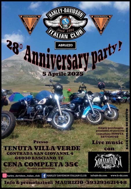 …lo storico Staff degli H-DIC Italian Club – Regione ABRUZZO, con la Direzione del Presidente Maurizio, ha organizzato per Sabato 05 Aprile 2025, una Cena per il “28°Anniversary Party!”, presso nota Tenuta a Basciano (TE)… special guest il Fondatore Giovanni “Giovannone”… in atmosfera country, lauta Cena con Live Music… a seguire Torta dell’Anniversario & a tarda sera Targa H-Dic di ringraziamento, donata ai Groups presenti… la nostra Delegazione ha consegnato al Presidente & Direttivo, la nostra Targa Friends (aggiornata 2025)… Reportage condiviso, tutt’ok!!!… by Angel.