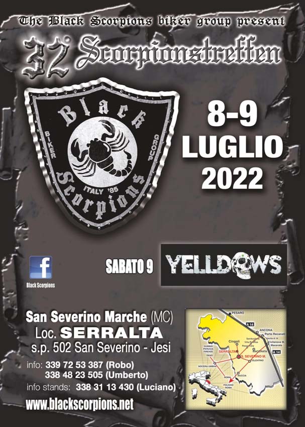 …lo Staff degli “Scorpioni” di S.Severino Marche (MC), ha organizzato il “32°Scorpionstreffen” dal 08 al 09 Luglio 2022, fuori la Frazione di Serralta… per Bikers, Riders & Trikers, duplice (Meat & Fish) Food & Beer, Tour cittadino, Merchandising BlackScorpions, LiveMusic, BikersShop, FreeCamping & duplice FreeParking Auto, etc… Reportage condiviso, un salutone al Presidente Luciano & Staff tutto, tutt’ok!!!… by Angel.