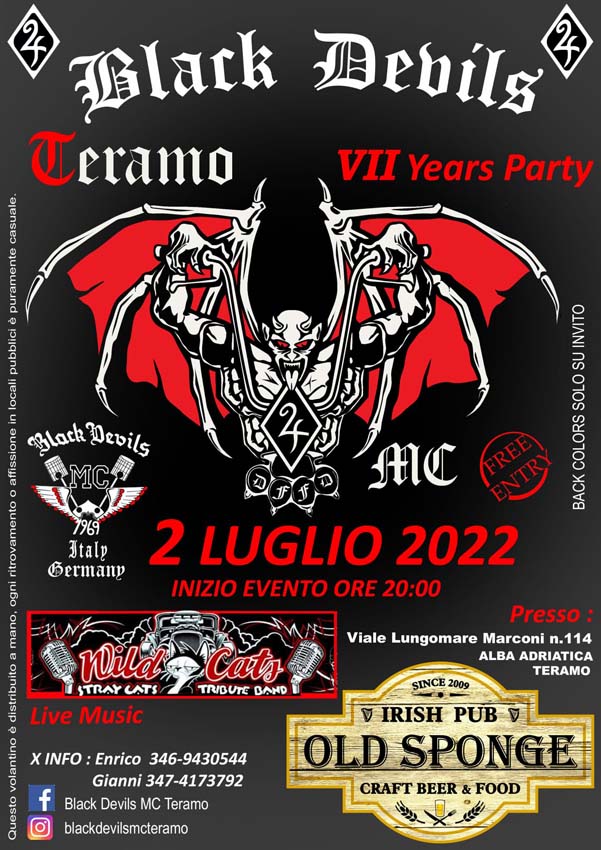 …il Chapter TERAMO dei BD24 MC, nella serata di Sabato 02 Luglio 2022, ha organizzato presso noto IrishPub ad Alba Adriatica (TE), il “7°Years-Party”… Food & Beer, Live-Music, Gadgets-Shop, Reserved Parking, etc… un ringraziamento & salutone al Presidente Gianni & Staff tutto… tutt’ok!!!… by Angel.