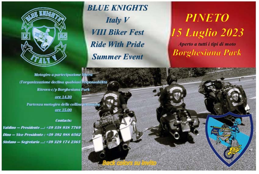 …lo Staff dei BlueKnights LE MC Italy V Teramo, ha organizzato per Sabato 15 Luglio 2023, a Pineto (TE), la “8°BikerFest” – (Ride With Pride Summer Event)… ricco Programma con Tour collinare abruzzese, tra’ cui la culturale Visita al Museo della Torre Cerrano, rientro per LiveMusic, Cabaret, Food & Beer… a tarda sera Premiazione Group, esterni compresi… Reportage condiviso in DUE parti, un ringraziamento & saluto allo Staff tutto & Presidente Valdino… tutt’ok!!!… by Angel.