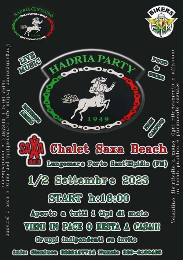 …lo Staff dei M.C.Hadria Centauro – Since 1949 (FMI) di Porto Sant’Elpidio (FM), ha organizzato l’evento “Hadria Party”, sul Lungomare Sud presso noto Chalet (Lido), dal 01 al 02 Settembre 2023, dalle ore 16:00… ricco Programma per i Bikers con Fish & Meat Food nonche’ Pizza, Beer & Cocktail, Live Music, Free Camping & Parking, Patch evento con “baffo” del 2023. Premiazione Groups… occasione per consegnare al Presidente & Staff, la nostra Targa Friends per ringraziare l’ospitalita’ ricevuta… Reportage condiviso, tutt’ok!!!… by Angel.