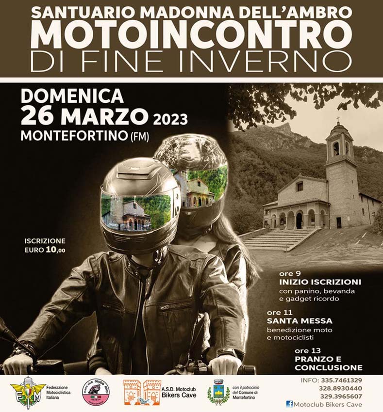…nella storica cornice montana del Santuario della Madonna dell’Ambro, si e’ tenuto per Domenica 26 Marzo 2023, il “Motoincontro Di Fine Inverno”… organizzato in sinergia dal M.C.Guido Paci (FMI) di Montegiorgio (FM) & il M.C.Bikers Cave (FMI) di Falerone (FM)… Iscrizioni & Colazioni, Santa Messa & Benedizione Moto (oltre 2600) non che’ per i Conduttori, Pranzo convenzionato… Reportage condiviso, tutt’ok!!!… by Angel.