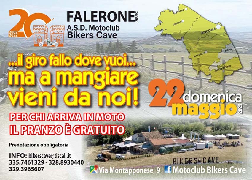 …nella bella cornice di campagna della ClubHouse del M.C.BikersCave (FMI) di Falerone (FM), Domenica 22 Maggio 2022 si e’ tenuto oltre il libero Tour individuale, un rustico “Pranzo Biker”, offerto per gli Amici del Club intervenuti in Moto… un saluto & ringraziamento al Presidente Franco & Staff tutto, Reportage condiviso, & un arrivederci a Giugno per l’Evento ufficiale, tutt’ok!!!… by Angel.