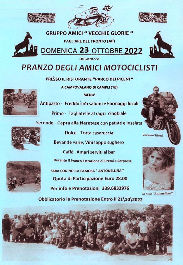 …il Gruppo Amici “Vecchie Glorie” di Pagliare del Tronto (AP), ha organizzato per Domenica 23 Ottobre 2022, presso noto Ristorante in zona di Campovalano di Campli (TE), il “Pranzo Degli Amici Motociclisti”, con ricca Lotteria, con la Speaker Antonella… Reportage condiviso, un salutone al Patron & Presidente Vincenzo Triozzi, con l’augurio per l’Appuntamento al 1°Maggio’23… by Angel.