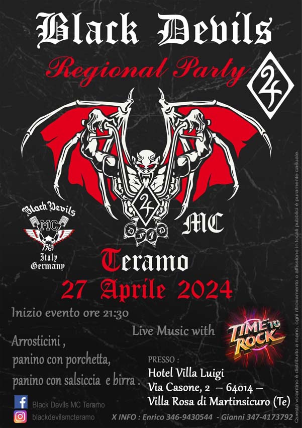 …lo Staff dei Black Devils MC Teramo, ha organizzato per Sabato 27 Aprile 2024, il “Regional Party”, dalle ore 21:30, presso nota Struttura Alberghiera collinare… Arrosticini & Porchetta, Live Music, Food & Beer, Free Parking, Stand Gadgets BD24, etc… ad inizio serata noi Bikers, abbiamo consegnato una Targa Friends al Presidente & Staff… un cordiale ringraziamento ai BD24 MC TE, per l’ospitalita’ donataci… Reportage condiviso, tutt’ok!!!… by Angel.